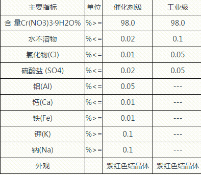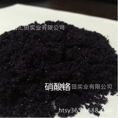 性質(zhì)和用途:硝酸鉻·九水為紫紅色有潮解性結(jié)晶,加熱到125.5℃時分解, 熔點為60℃, 溶于乙醇,丙酮和無機酸,易溶于水,其水溶液加熱時呈綠色,冷卻后又迅速變?yōu)榧t紫色。有腐蝕性,能引起灼傷。與易燃物品接觸能引起燃燒。常用于制備含鉻催化劑,印染工業(yè)用作煤染劑,用于玻璃和陶瓷釉彩和腐蝕阻抑劑。