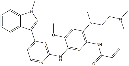 英文名稱:AZD-9291; AZD-9291;N(2{[2(diMethylaMino)ethyl](Methyl)aMino}4Methoxy5{[4(1Methyl1Hindol3yl)pyriMidin2yl]aMino}phenyl)prop2enaMide;N-[2-[[2-(Dimethylamino)ethyl]methylamino]-4-methoxy-5-[[4-(1-methyl-1H-indol-3-yl)-2-pyrimidinyl]amino]phenyl]-2-prope...