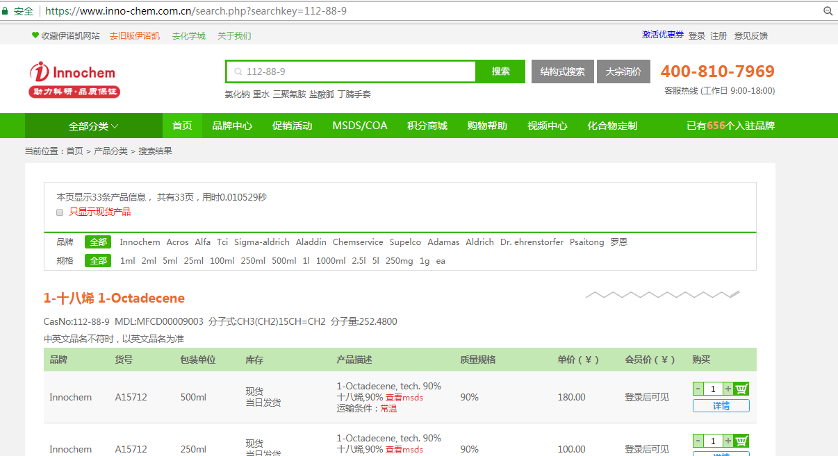 We have many Acting brands, such as octadecene, which is a chemical reagent. We have innochem, across, Alfa, TCI, sigma Aldrich, Aladdin, chemservice, supelco, adamas, Aldrich, Dr. ehrenstorfer, psaitong, Ron and other brands. Our headquarters are in Beijing, branches in Shanghai and Guangzhou, offices in many cities across the country, and services to universities and scientific research institutes all over the country Chemical enterprises, pharmaceutical enterprises, etc.