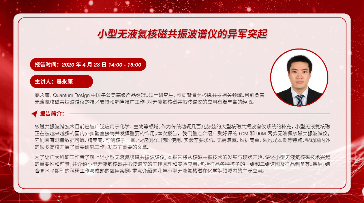 暴永康,Quantum Design中國子公司高級產品經理。碩士研究生,科研背景為核磁共振相關領域。目前負責無液氦核磁共振波譜儀的技術支持和銷售推廣工作,對無液氦核磁共振波譜儀的技術及應用積累了多年豐富經驗。