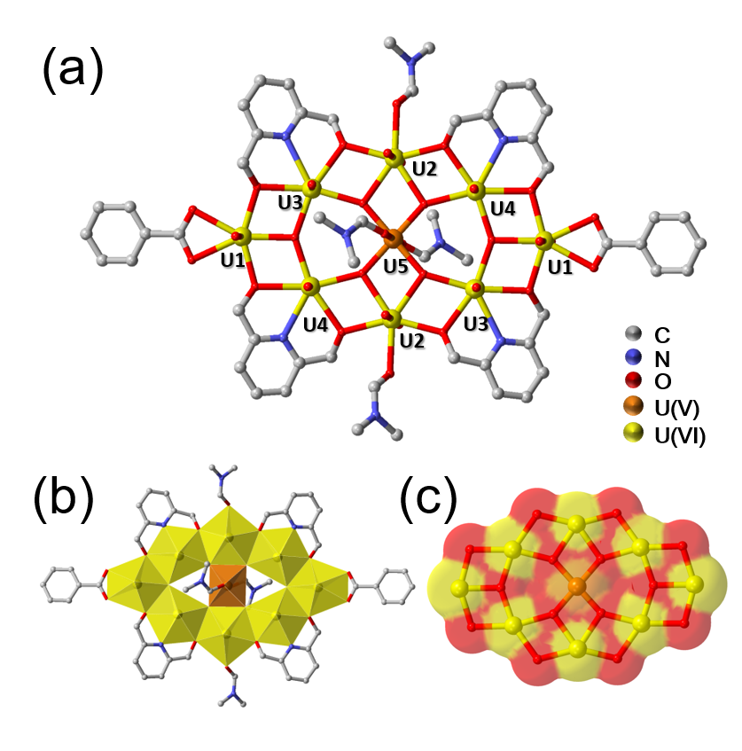 團隊采用了常規溶劑熱法,以硝酸鈾酰、有機硼酸酯和苯甲酸為原料,通過原位還原獲得了一種新的V/VI混合價態鈾簇(1),該化合物是目前最大的基于“tetraoxo核”的混價鈾簇。單晶衍射數據顯示化合物1為九核簇,其中包括一個U(V)和八個U(VI)。U(V)為六配位模式,平面有四個μ3-O原子、軸向為兩個DMF分子提供的O原子,為典型的“tetraoxo核”;其余八個U(VI)為平面五配位、兩個軸向鈾酰氧的五角雙錐構型。