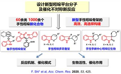 石楓教授課題組一直致力于手性雜環化學的研究,近年來聚焦于手性吲哚化學。針對手性吲哚化學的關鍵科學問題,該課題組采用了獨特的研究策略——設計新型吲哚平臺分子及其參與的催化不對稱新反應,實現了具有挑戰性的新型手性吲哚骨架的高效、高選擇性構建,為手性吲哚化合物的應用研究提供了高效的合成方法學和豐富的化合物庫。該課題組還探究了該類反應的機制、催化模式、產物的生物活性和催化作用,發現了以2-吲哚甲醇極性反轉為代表的吲哚新化學,推動了手性吲哚化學的發展,2020年受邀為國際知名期刊Acc.Chem. Res.作綜述(圖1)。