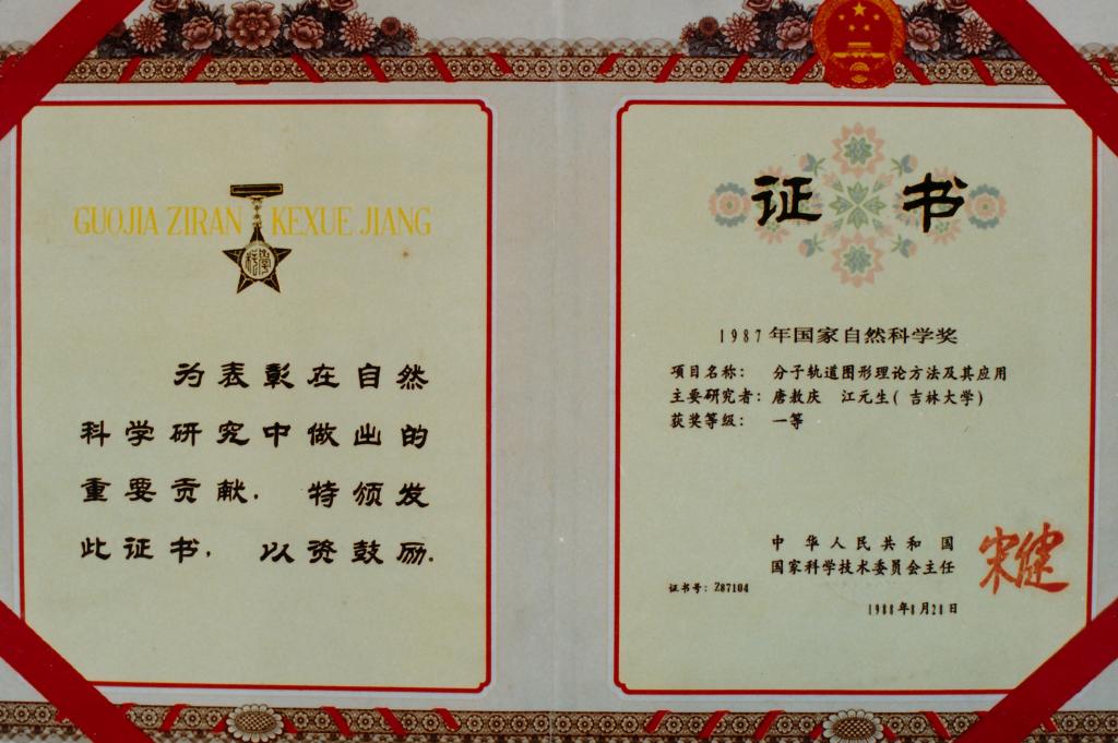圖20:唐敖慶等人獲1987年國家自然科學獎一等獎證書
