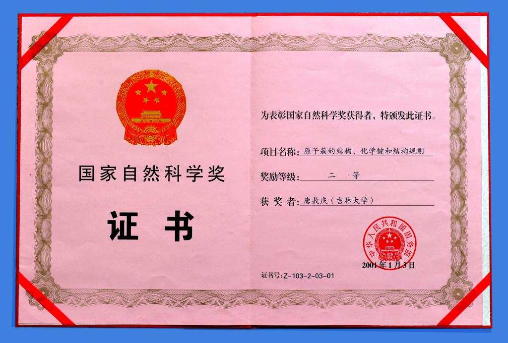 到20世紀90年代,唐敖慶已是耄耋老人,但他不顧年邁體弱,仍和他的研究集體開展高碳原子簇化學的理論研究。這項研究所取得的主要成果為原子簇化合物的分子設計和合成提供了理論依據。“原子簇結構、化學鍵和結構規則”這一重要研究成果獲2000年國家自然科學獎二等獎。該科研成果已撰寫成專著《原子簇的結構規則和化學鍵》,由山東科學技術出版社于1998年出版。