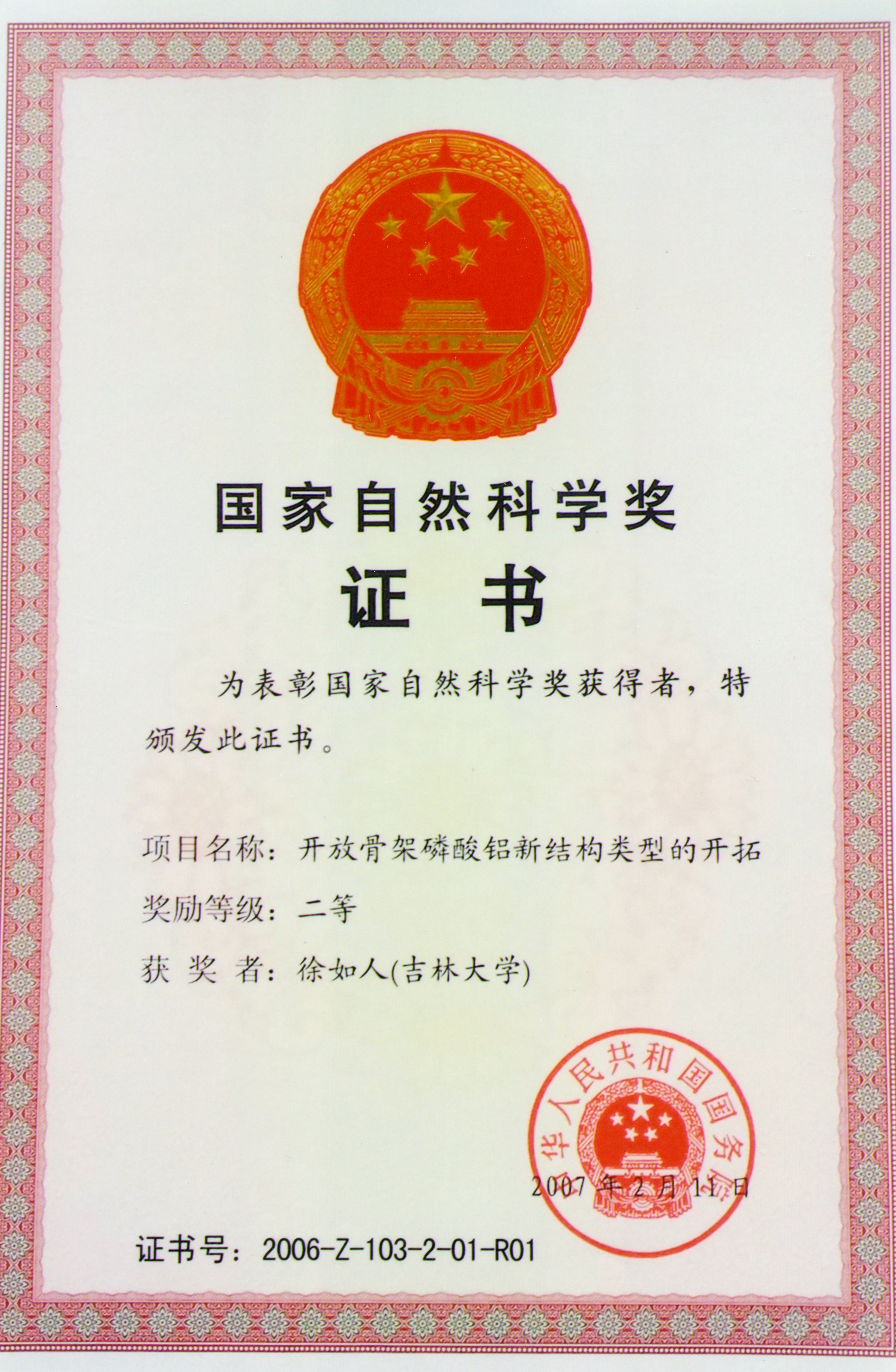 圖12:2007年,徐如人課題組獲國家自然科學二等獎證書