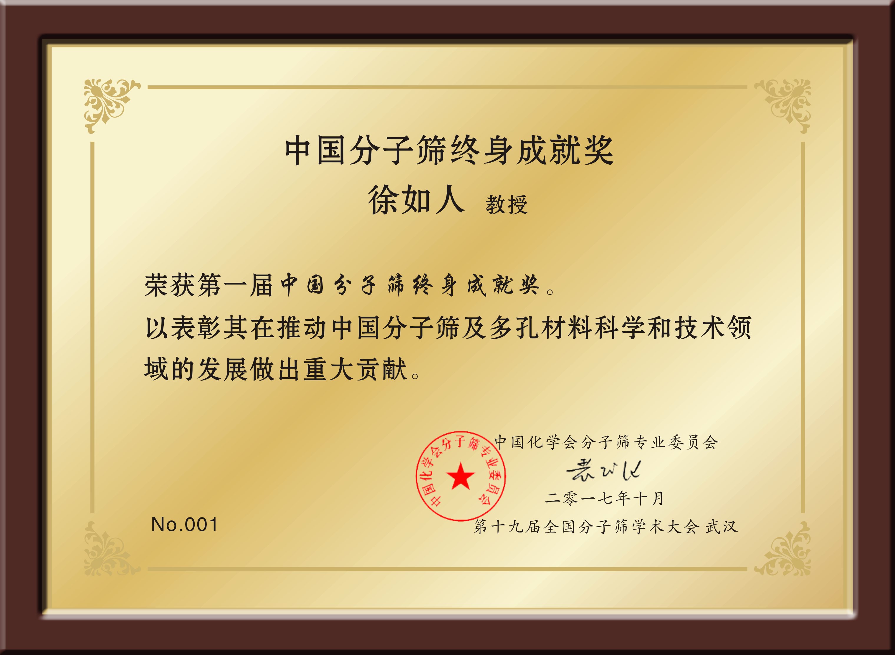 圖25:2017年10月25日,在第十九屆全國分子篩大會上,徐如人被中國化學會分子篩專業委員會隆重授予首屆“中國分子篩研究終身成就獎”