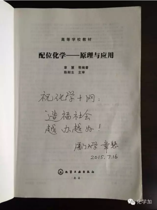 導讀:踐行“萃聚英才,共享化學”文化,由“化學+網”去年下半年發起的以“尊重化學知識,感恩化學主編”為主題的公益籌書活動,已得到包括北大、清華、南開、浙大、蘭大、廈大、復旦、中大、川大、北師大、南京大學、大連理工、華南理工、上海交大、西北工大、中科院上海藥物研究所、中科院蘭州化物所、中科院大連化物所、中核四O四公司等70多所大學、機構,108位化學主編的熱情支持并參與。更多活動詳情,歡迎用電腦訪問化學+網官網了解!本期推送【化學主編風采】系列連載之:廈門大學章慧教授,她于2015年7月16日向化學+網贈送了《配位化學—原理與應用》一書。化學+網在此由衷的向章老師致以深深的敬意,并由衷的感謝她給予我們化學+網的支持和鼓勵!