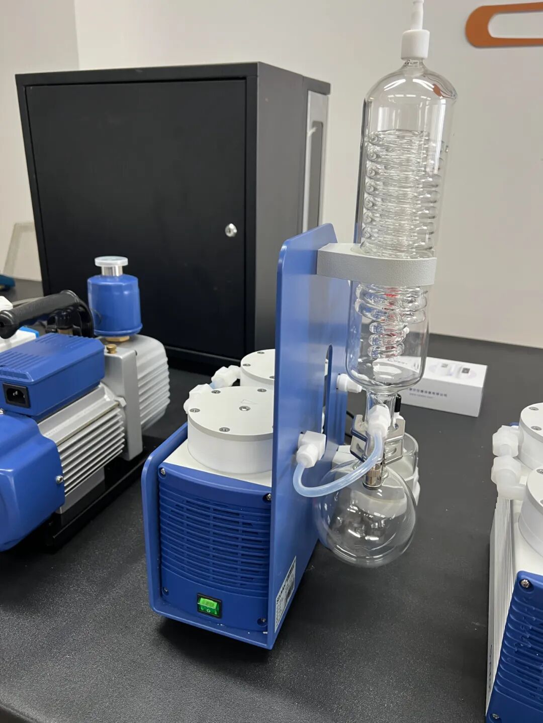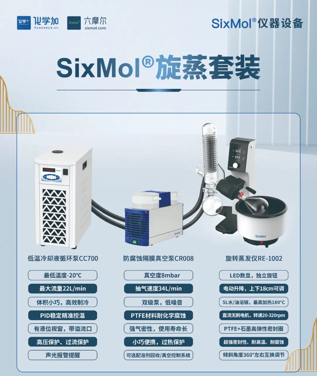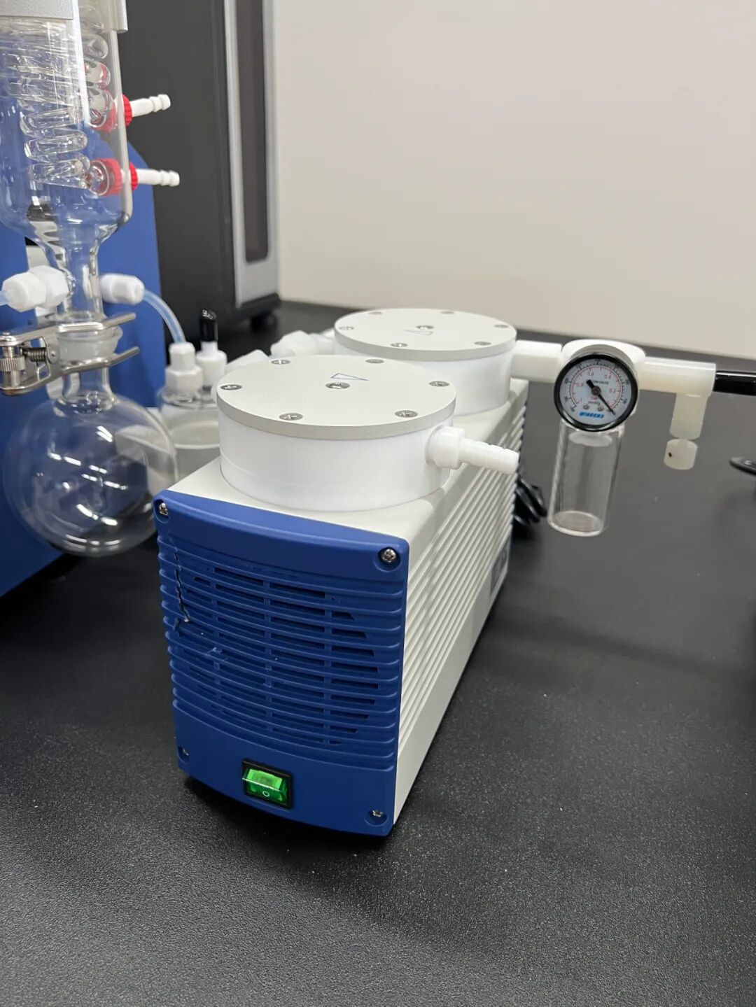 化學加SixMol?防腐蝕隔膜真空泵,搭配溶劑回收系統,真空泵的入口接有緩沖瓶,出口接有冷凝器可以二次冷凝,回收低沸點溶劑,有效減少環境危害,為您的實驗室安全保駕護航。