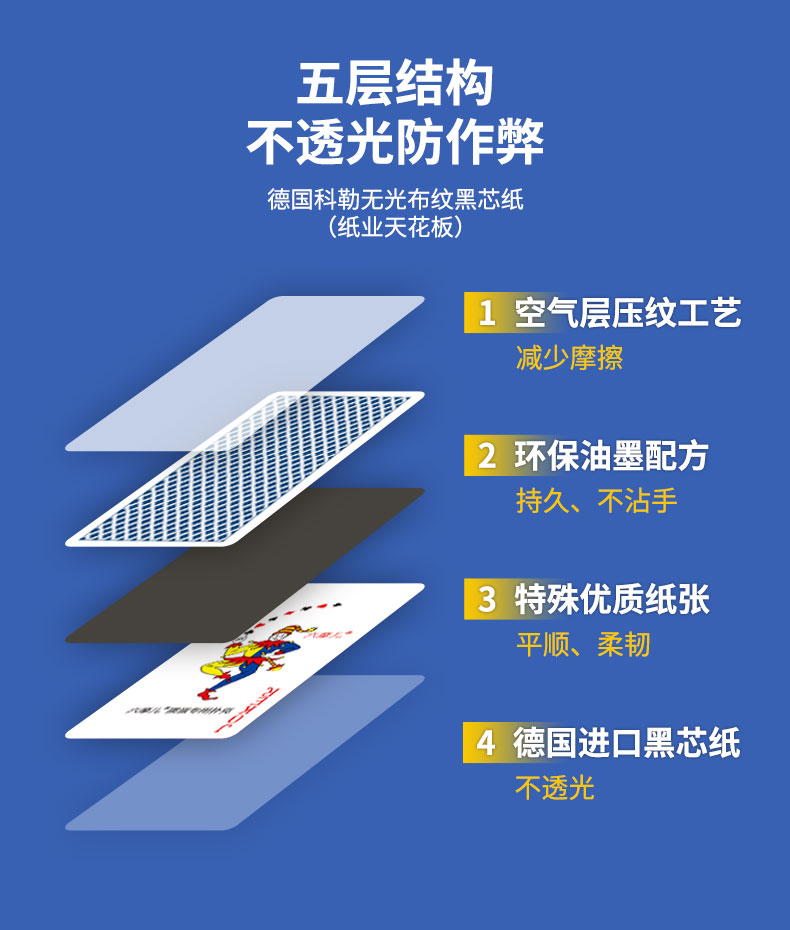 六摩兒?摜蛋比賽專用高端撲克牌:55*100mm創新尺寸握牌更舒服,德國進口布紋黑芯紙清晰順滑更耐用