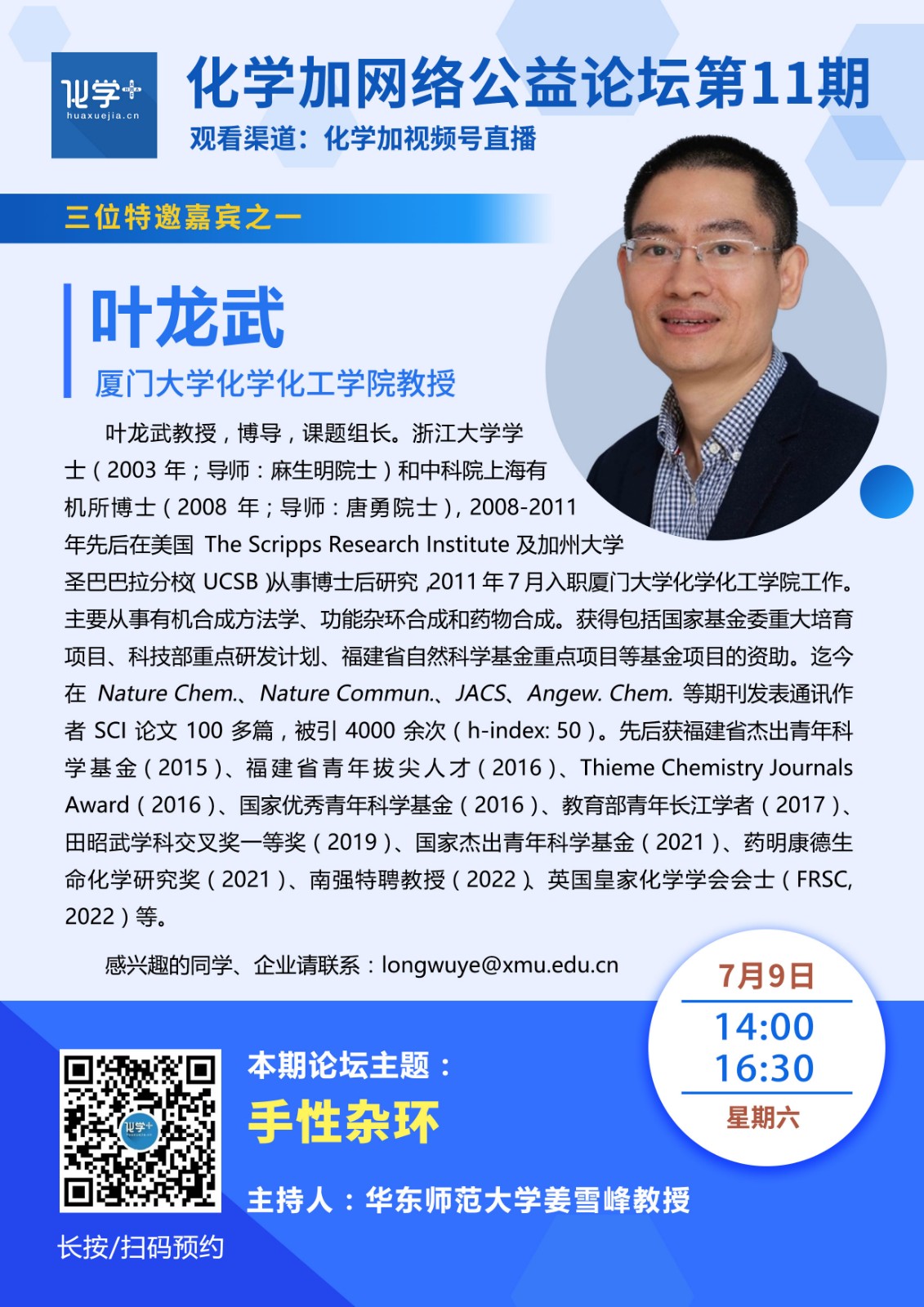 導讀:化學加網絡公益論壇第11期將于2022年7月9日(星期六)14:00-16:30舉行,我們很高興邀請到了武漢大學化學與分子科學學院王春江教授、江蘇師范大學化學與材料科學學院石楓教授、廈門大學化學化工學院葉龍武教授 等三位嘉賓做報告分享,本期論壇由華東師范大學姜雪峰教授擔任主持人,共同探討“手性雜環”。歡迎關注化學加微信公眾號、化學加視頻號預約觀看直播。