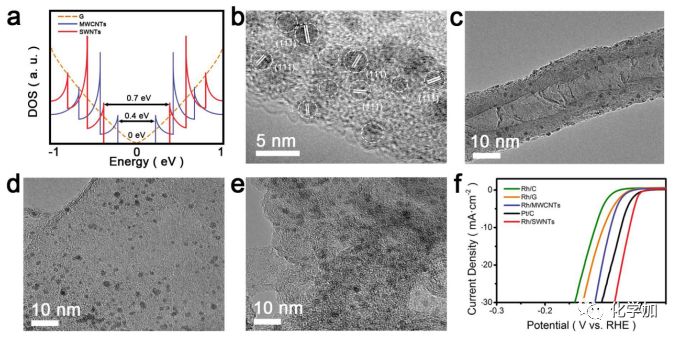 圖1. (a) 石墨烯,多壁碳納米管和單壁碳納米管的電子態密度。(b, c, d, e, f) Rh/SWNTs, Rh/MWCNTs, Rh/G和Rh/C的TEM圖和酸性HER性能。