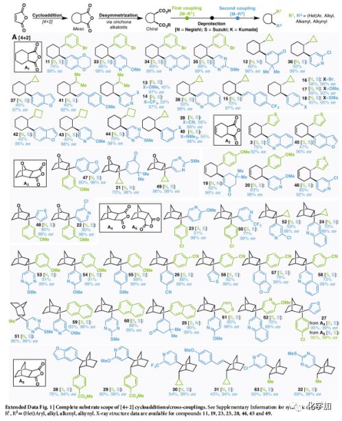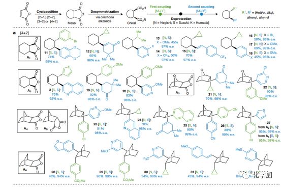 首先從狄爾斯-阿爾德反應開始(Fig. 2a)。狄爾斯-阿爾德反應構建的A1-A6在鄧組開發的去不對稱條件下(以奎寧或奎尼丁為路易斯堿)催化不對稱醇解,得到高對應選擇性的單酸單酯底物,而后連續進行Negishi和Suzuki類型的RCC反應。通過此過程,可將簡單廉價的狄爾斯-阿爾德反應產物A1轉化為具有高對應選擇性以及高附加值的產品(11到63,涵蓋了芳香基、雜芳香基、烯烴、具有張力的環丙基、環丁基以及簡單片段甲基和異丙基)。大多情況下狄爾斯-阿爾德反應往往需要缺電的烯烴和富電的雙烯,使得反應的多樣性大大受限,但文中的方法可以構建常規狄爾斯-阿爾德反應不能得到的產物(不論消旋還是手性)。此外,在傳統狄爾斯-阿爾德反應中,當雙烯片段里有多個烯烴存在時,無法有效地控制反應。但作者通過模塊化構建解決了此類問題(12、15、19、21、25 和31)。有趣的是外型和內型異構體A4、A5,在調整反應次序后均可得到相同的產物27。