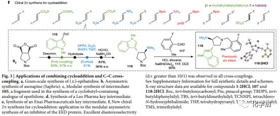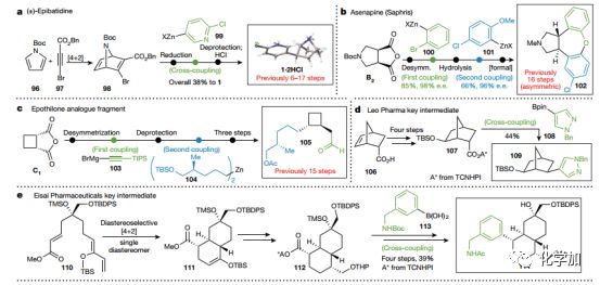 Fig.3 結合環加成和碳碳鍵雜交偶聯反應的應用a.克級合成(±)-epibatidine. b.不對稱合成asenapine (Saphris). c.模塊化合成中間體 105d.合成Leo Pharma的關鍵中間體 e.合成Eisai Pharmaceuticals的關鍵中間體f.新手性2π 合成子應用于環加成