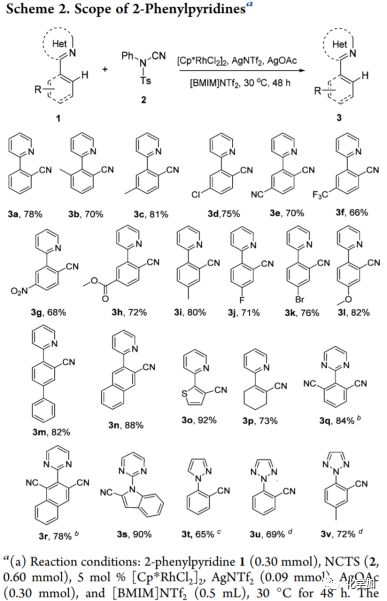 在最優反應條件下,作者首先考察了2-苯基吡啶的C-H鍵氰化。連有給電子基或吸電子基的底物都能與反應體系兼容,并以良好的收率得到相應的氰化產物3a-3l。當2-苯基部分被2-聯苯基,2-萘基和2-噻吩基取代時,與3a相比,3m-3o的收率明顯提升。有趣的是,當2-芳香環被2-脂肪族環取代時(如2-環己烯),氰化反應仍能繼續進行形成產物3p,收率為73%。該結果表明氰化反應不僅能直接芳族官能化,也可以應用于脂族烯烴。值得注意的是,將導向基團(DG)變為其他N-雜環如嘧啶,吡唑和三唑也能順利得到氰化產物3q3v。