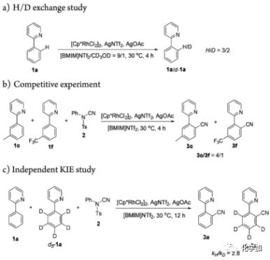 為了闡明該反應的機理,作者進行了一系列實驗。H/D交換實驗經1H NMR譜監測到1a中40%的鄰位C-H鍵被氘化,這表明C-H活化是可逆的。1c和1f的分子間競爭實驗表明C-H鍵氰化反應有利于富電子底物。在相同條件下,作者利用1a和d5-1a與偶聯劑NCTS(2)進行反應,測得其動力學同位素效應值kH/kD為2.8,這表明C-H鍵斷裂是反應的決速步。