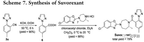 重要的是,芳香族氰化物作為藥物設計的合成砌塊具有重要意義。例如,上市藥物SuvxEnter是一種新型食欲素拮抗劑,且已成為治療原發性失眠癥的一類新型藥物。作者利用5-甲基-2-(2H-1,2,3-三唑-2-基)-芐腈(產物3u)經兩步合成Suvorexant,產率為79%。該成果可能為藥物的設計和合成提供新思路。