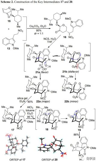 基于上述分析,作者首先探究了不對稱Michael加成反應(圖3)。作者以烯酮15(由L-阿拉伯糖經四步反應制備,dr值>98:2)作為Michael受體,以此獲得有用的立體控制。經過大量試驗篩選,作者發現無機堿能極大地促進吲哚片段13和二氫吡喃酮15的不對稱Michael加成,在優化的條件下,以95%的收率制備目標產物16,其為1:1的非對映異構體混合物。隨后,作者嘗試通過連續的串聯氧化和羥醛環化引入螺-N-甲氧基吲哚酮的季碳手性中心。作者認為關鍵的環化反應可能經歷兩個不同構型的過渡態(21a和21b)。過渡態21b中硝基和苯環之間具有較大的空間位阻,因而過渡態21a是更有利的,這將使得環化產物的構型與天然產物一致。此外,硝基和羥基之間穩定的氫鍵相互作用也有利于形成中間體21a。令人高興的是,在N-氯琥珀酰亞胺和水的條件下,2-氯吲哚經水解形成羥吲哚,其同時經歷羥醛環化專一地產生單一異構體氧雜二環[3.3.1]-壬烷17,產率為90%。值得注意的是,利用硅膠和三乙胺進行淬滅是硝基異構化后形成熱力學更穩定的異構體17的關鍵。制備大量的17之后,作者繼續探索了關鍵的pinacol重排反應,經過廣泛的條件優化,最終發現17在氯化鋁和甲苯/Et2O(10:1,v/v)的混合物中加熱回流能以30 mmol規模一次性得到酮20(8.6 g),產率為86%。氯化鋁/醚絡合物使得該重排反應尤其高效,可能是由于其溫和的路易斯酸性,單獨使用氯化鋁會導致17完全分解。