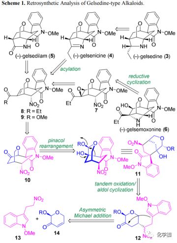從結構上看,gelsedine型生物堿具有共同的氧雜雙環[3.2.2]壬烷核心和螺-N-甲氧基吲哚酮部分,以及嵌入緊湊骨架中的多種官能化雜環(如吡咯烷,吡咯啉,吡咯烷酮或氮雜環丁烷環)(3-6; 圖1)。逆合成分析如圖2所示:作者設想該天然產物的合成多樣性可以由四環硝基化合物8或9經后期雜環化過程實現。具體而言,gelsemoxonine(6)可以由環氧化物7經過仿生環化衍生而來。同時,吡咯烷和吡咯啉有望通過乙酮8的分子內縮合和還原得到。同樣,5中的吡咯烷酮核心骨架可以通過酯9中的硝基和烯烴的還原,以及隨后的內酰胺化構建。化合物8或9可能來自中間體10中酮α位上的酰化,和隨后的一系列官能團轉化。10的氧雜雙環[3.2.2]壬烷骨架可以由簡化的氧雜二環[3.3.1]壬烷11經氧鎓離子誘導的頻哪醇重排構建。11中吲哚酮部分的季碳手性中心可以經三環12的串聯氧化/羥醛環化形成,其可由簡單底物13和14經Michael加成得到。