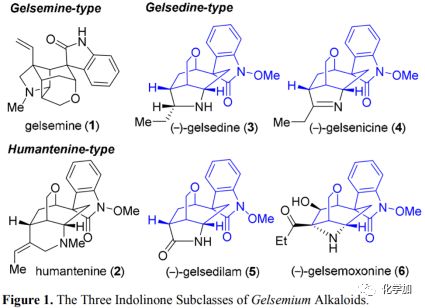 Gelsemium屬植物在傳統的亞洲醫學中已被廣泛用于治療皮膚潰瘍、皮炎等各種疾病。目前,科研人員已從Gelsemium植物中分離出一系列結構多樣的生物堿,其中一些生物堿具有良好的生物活性,包括鎮痛、抗炎和免疫調節以及強效抗腫瘤活性。在已知的五種類別的Gelsemium生物堿中,有三個亞家族具有共同的螺-吲哚啉酮骨架,即gelsemine型、humantenine型和gelsedine型生物堿(圖1)。Gelsemium生物堿展示出的生物活性及其密集的多環結構已受到合成界的廣泛關注。值得注意的是,盡管已有多種gelsemine的合成方法,但gelsedine型生物堿所受關注較少,迄今為止只有少數半合成和全合成的報道。