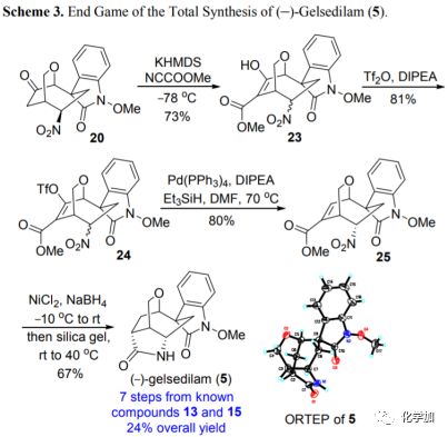 以高效的方式快速構建了共同的四環骨架后,作者隨即進行了(-)-gelsidilam的全合成(圖4)。因此,20在KHMDS和Mander試劑(甲基氰基甲酸酯)作用下,在酮基的α-位引入羧甲氧基,產率為73%。接著,在三氟甲磺酸酐和Hünig堿的條件下將烯醇混合物23轉化為相應的烯醇三氟甲磺酸酯24。隨后利用Pd(PPh3)4和Et3SiH還原脫去三氟甲磺酸酯基團得到α,β-不飽和甲酯25。最后,酯25經硼氫化鎳介導的烯烴和硝基還原,得到非環化中間體,其與硅膠在40 ℃下加熱即可得到對映體富集的(-)-gelsidilam(5)。該合成路線以13和15為起始原料,只經7步就能以24%的收率得到(-)-gelsidilam(5)。