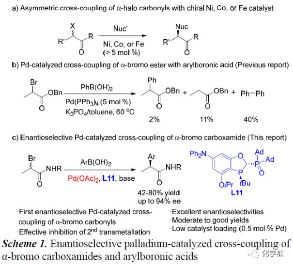 過渡金屬催化的不對(duì)稱芳基-烷基交叉偶聯(lián)反應(yīng)受到化學(xué)家們的極大關(guān)注,且已經(jīng)取得了不錯(cuò)的進(jìn)展,但其催化劑用量較高,因此開發(fā)實(shí)用、有效的不對(duì)稱芳基-烷基交叉偶聯(lián)反應(yīng)顯得尤為重要。簡(jiǎn)單易得的α-鹵代羰基化合物與芳基金屬試劑的不對(duì)稱交叉偶聯(lián)反應(yīng)是制備手性α-芳基羰基化合物最強(qiáng)有力的方法之一。Fu課題組、鐘江春和邊慶花團(tuán)隊(duì)以及Nakamura課題組已成功應(yīng)用手性Ni,Co和Fe等過渡金屬催化該類不對(duì)稱交叉偶聯(lián)反應(yīng),但其催化劑用量普遍> 5mol%(Scheme 1a)。若將上述催化劑換成低催化劑用量的Pd催化似乎是個(gè)不很好地解決辦法。到目前為止,已有關(guān)于低催化劑用量的Pd催化α-溴代酯和苯硼酸的偶聯(lián)反應(yīng)的報(bào)道,但其主產(chǎn)物為苯硼酸發(fā)生自身偶聯(lián)反應(yīng)生成的還原酯和聯(lián)苯(Scheme 1b)。在上述背景研究的基礎(chǔ)上,中科院上海有機(jī)化學(xué)研究所湯文軍團(tuán)隊(duì)報(bào)道了第一例Pd催化α-溴代酰胺化合物與芳基硼酸的不對(duì)稱交叉偶聯(lián)反應(yīng),能以良好的收率和優(yōu)異的對(duì)映選擇性得到一系列手性α-芳基酰胺化合物。