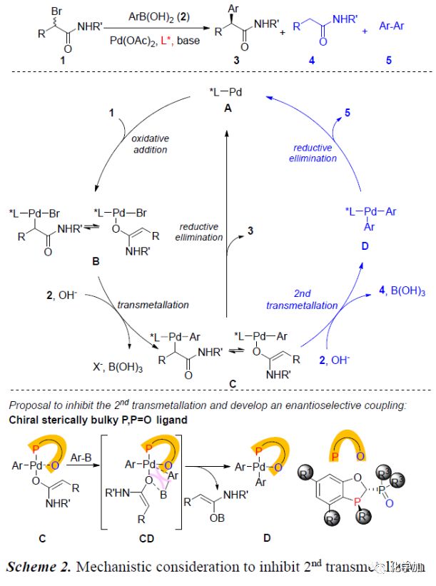 Pd催化α-鹵代羰基化合物與芳基硼酸的交叉偶聯(lián)反應(yīng)一直難以實(shí)現(xiàn)的主要原因是:Pd(0)中間體A促使α-鹵代羰基化合物1發(fā)生氧化加成反應(yīng)生成O-烯醇化物或C-烯醇化物B。B與芳基硼酸2發(fā)生過渡金屬轉(zhuǎn)移反應(yīng)會(huì)生成Pd(II)中間體C。C一般不會(huì)直接發(fā)生還原消除反應(yīng)得到偶聯(lián)產(chǎn)物3,而會(huì)與芳基硼酸進(jìn)行第二次過渡金屬轉(zhuǎn)移過程生成4和Pd(II)中間體D。緊接著,D發(fā)生還原消除反應(yīng)生成5(Scheme 2)。為了得到理想的偶聯(lián)產(chǎn)物3,作者猜想應(yīng)用空間位阻較大的磷配體可以有效地抑制C的第二次金屬轉(zhuǎn)移反應(yīng),從而實(shí)現(xiàn)Pd催化α-溴羰基化合物的不對(duì)稱交叉偶聯(lián)反應(yīng)。