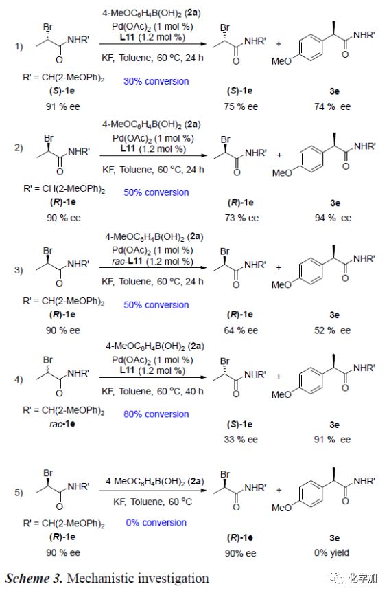 外消旋α-溴代甲酰胺化合物能發(fā)生偶聯(lián)反應(yīng),說明該交叉偶聯(lián)反應(yīng)為動(dòng)力學(xué)拆分過程。為了進(jìn)一步了解催化劑和絡(luò)合物L11在該反應(yīng)中所起的作用,作者進(jìn)行了一系列對(duì)照實(shí)驗(yàn)(Scheme 3)。首先,作者分別制備了純的(S)-1e和(R)-1e分別在標(biāo)準(zhǔn)條件下反應(yīng),發(fā)現(xiàn):(S)-1e和(R)-1e均轉(zhuǎn)化為相同構(gòu)型的產(chǎn)物3e,但3e的對(duì)映選擇性不同且(R)-1e的轉(zhuǎn)化率高于(S)-1e的轉(zhuǎn)化率(equations 1&2)。若將手性L11換成消旋的,其它條件保持不變,(R)-1e可以50%的轉(zhuǎn)化率和52%的對(duì)映選擇性得到相應(yīng)產(chǎn)物(equations 3)。當(dāng)反應(yīng)轉(zhuǎn)化率達(dá)到80%時(shí)終止反應(yīng),可以91%對(duì)映選擇性分離出產(chǎn)物3e,同時(shí)以33%ee的對(duì)映選擇性回收1e(equations 4)。標(biāo)準(zhǔn)條件下,不加入Pd催化劑,該反應(yīng)不能得到目標(biāo)產(chǎn)物(equations 5)。這些對(duì)照實(shí)驗(yàn)說明Pd催化劑決定反應(yīng)能否發(fā)生,而手性配體決定產(chǎn)物的構(gòu)型。