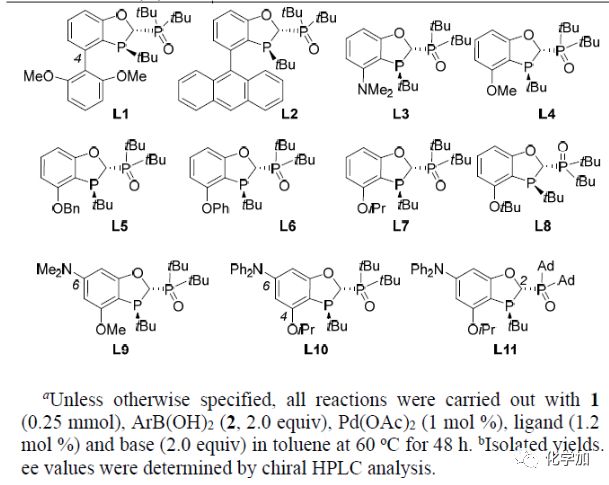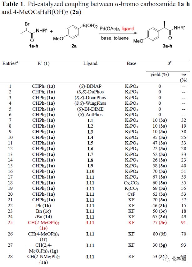 以N-二苯甲基-2-溴丙酰胺1a和4-甲氧基苯硼酸2a為模板底物,作者對(duì)反應(yīng)條件進(jìn)行反復(fù)篩選,確定最優(yōu)條件為(Table 1):N-二鄰甲氧基苯甲基-2-溴丙酰胺1e和4-甲氧基苯硼酸2a為模板底物,1 mol% Pd(OAc)2和1.2 mol %L11為催化劑,2.0 equiv KF為堿,甲苯為溶劑,在60oC條件下反應(yīng)48 h,能以77%的收率和91%的對(duì)映選擇性得到目標(biāo)產(chǎn)物。