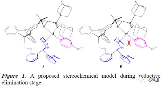 作者提出了Pd(II)絡(luò)合物在還原消除過程中的立體化學(xué)模型(Figure 1)。基于作者之前的報(bào)道以及空間位阻的影響,異構(gòu)體A和B是還原消除過程最主要的中間體。其中,異構(gòu)體B主要與還原消除或過渡金屬轉(zhuǎn)移過程相關(guān),而異構(gòu)體A則與偶聯(lián)產(chǎn)物的生成以及產(chǎn)物的立體選擇性相關(guān)。