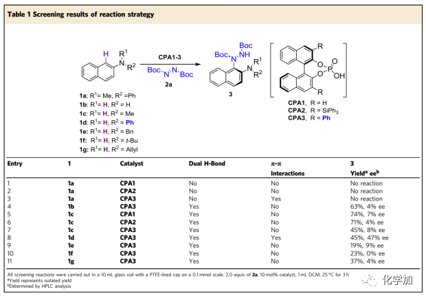手性磷酸可同時活化含弱酸性氫原子的2-萘胺和偶氮二羧酸酯生成雙重氫鍵中間體A,從而構(gòu)建手性N-C軸(Fig. 2a)。因此,作者使用N-取代2-萘胺1和偶氮二甲酸二叔丁酯(DBAD)2a作為模板底物,并對反應(yīng)進(jìn)行了篩選(Table 1)。作者發(fā)現(xiàn)N-Me,Ph二取代的2-萘胺1a不能得到相應(yīng)產(chǎn)物,而具有N-H鍵的偶氮二羧酸酯1b和1c則能順利得到相應(yīng)的胺化產(chǎn)物。這些結(jié)果表明N-H鍵對該反應(yīng)起著至關(guān)重要的作用。但即使使用位阻較大的Ph-或Ph3Si-取代的手性磷酸,該反應(yīng)的對映選擇性均較低。理論上,通過增大2-萘胺C8位取代基的空間位阻是可以提高產(chǎn)物的對映選擇性得,但這會極大地限制該反應(yīng)的底物范圍。