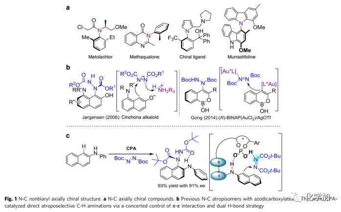 軸手性化合物廣泛存在于手性催化劑及配體中,其化學(xué)合成備受關(guān)注。BINAP和BINOL等二芳基軸手性化合物的合成已經(jīng)取得了不錯的進(jìn)展,但關(guān)于合成同樣重要的非二芳基N-C軸手性化合物(Fig. 1a)的報(bào)道卻很少。到目前為止,合成非二芳基N-C軸手性化合物的方法主要包括手性拆分和對非手性N-C鍵化合物進(jìn)行不對稱環(huán)化反應(yīng)、N-官能團(tuán)化反應(yīng)和去對稱化反應(yīng)等,而通過構(gòu)建新的N-C鍵合成手性非二芳基N-C軸手性化合物仍然面臨巨大的挑戰(zhàn)。