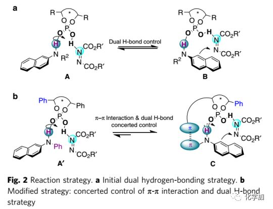 J?rgensen課題組開發(fā)了金雞納生物堿催化8-氨基-2-萘酚衍生物與偶氮二羧酸酯的不對稱非二芳基軸向手性胺化反應(yīng),這是非二芳基軸手性化合物合成領(lǐng)域中具有里程碑意義的報(bào)道(Fig. 1b)。2014年,龔流柱課題組報(bào)道了Au-催化偶氮二羧酸酯的環(huán)化異構(gòu)化/胺化串聯(lián)反應(yīng),構(gòu)建雜芳基軸手性化合物。在此基礎(chǔ)上,上海交通大學(xué)張書宇團(tuán)隊(duì)開發(fā)了手性磷酸催化N-芳基-2-萘胺與偶氮二羧酸酯的分子間不對稱C-H胺化反應(yīng),構(gòu)建N-C軸手性的非二芳基萘-1,2-二胺骨架,其中該報(bào)道使用了π-π相互作用和雙重氫鍵協(xié)同控制策略(Fig. 1c)。