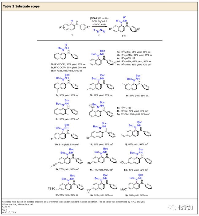 確定N-苯基-2-萘胺1d和DBAD 2a為模板底物后,作者通過對催化劑、溶劑、溫度等反應(yīng)條件進(jìn)行篩選,確定最優(yōu)的反應(yīng)條件(Table 2):10 mol% CPA6為催化劑,DCM:Et2O = 7:3為溶劑,在-70 ℃條件下反應(yīng)48 h,能以93%的收率和91%的對映選擇性得到相應(yīng)產(chǎn)物。