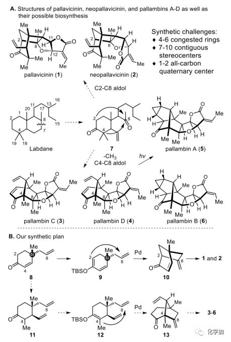 自1994年以來,化學家們從苔類植物中分離和表征了一組具有并環呋喃酮的非常復雜的二萜化合物,如pallavicinin (1)、pallavicinin (2)和pallambins A-D(3-6)(圖1A),它們含有4-6個擁擠環和7-10個連續手性中心,包括1-2個全碳季碳中心,其全合成極具挑戰。然而,這類天然物并沒有顯示出顯著的生物活性,可能是因為它們自然來源極少,從而限制了其生物評價。因此,對這些二萜類化合物進行簡明的化學合成可以提高這些分子的可用性,以便進行全面的生物評估。