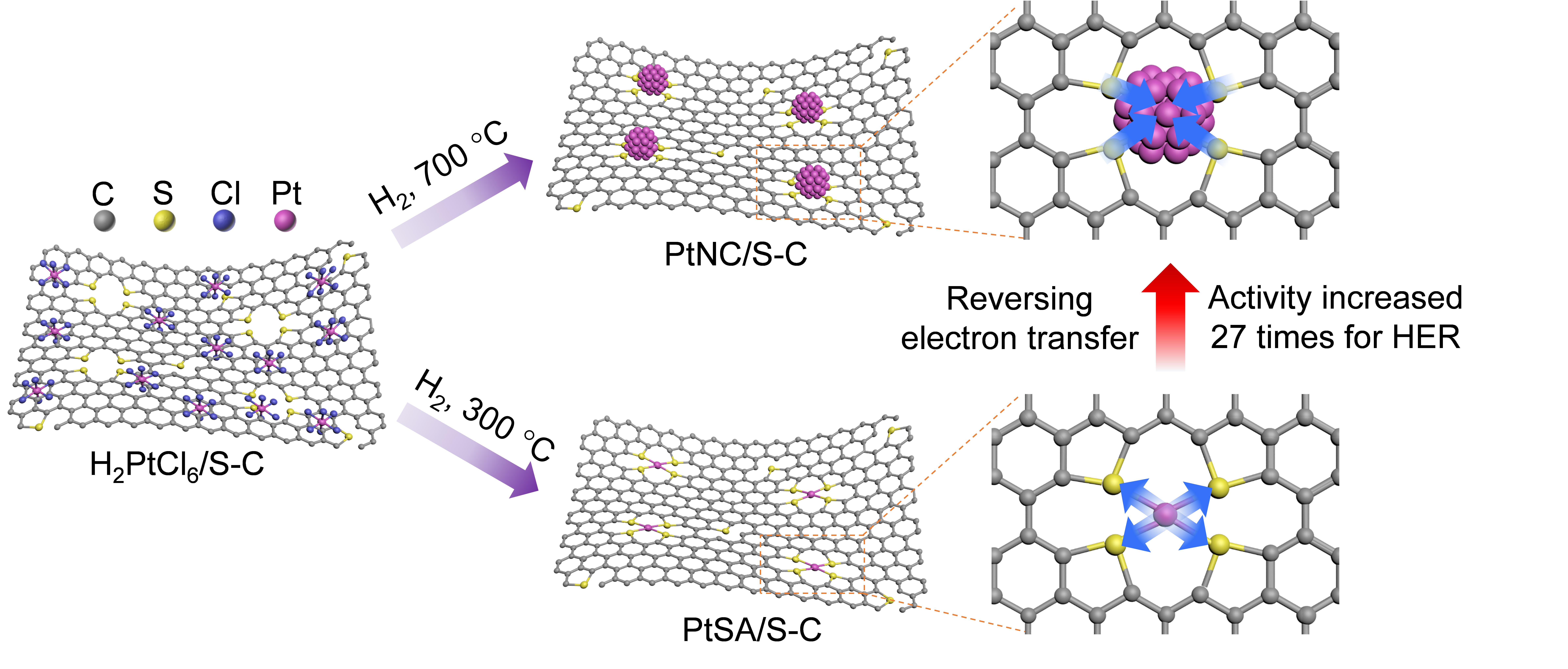 圖1. S-C負載的Pt單原子與Pt納米團簇合成示意圖以及電荷轉移變化。