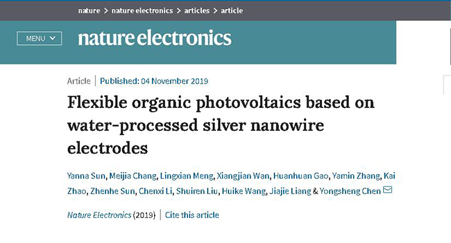 文章介紹,陳永勝團隊制備了同時具有高導電、高透光且低表面粗糙度的銀納米線柔性透明電極,將其用于構筑柔性有機太陽能電池,與使用商業氧化銦錫(ITO)玻璃電極的器件性能相當,光電轉化效率可達16.5%,刷新了文獻報道的柔性有機/高分子太陽能電池光電轉化效率的最高記錄。這一成果使得高效柔性有機太陽能電池距離實現產業化更近一步。