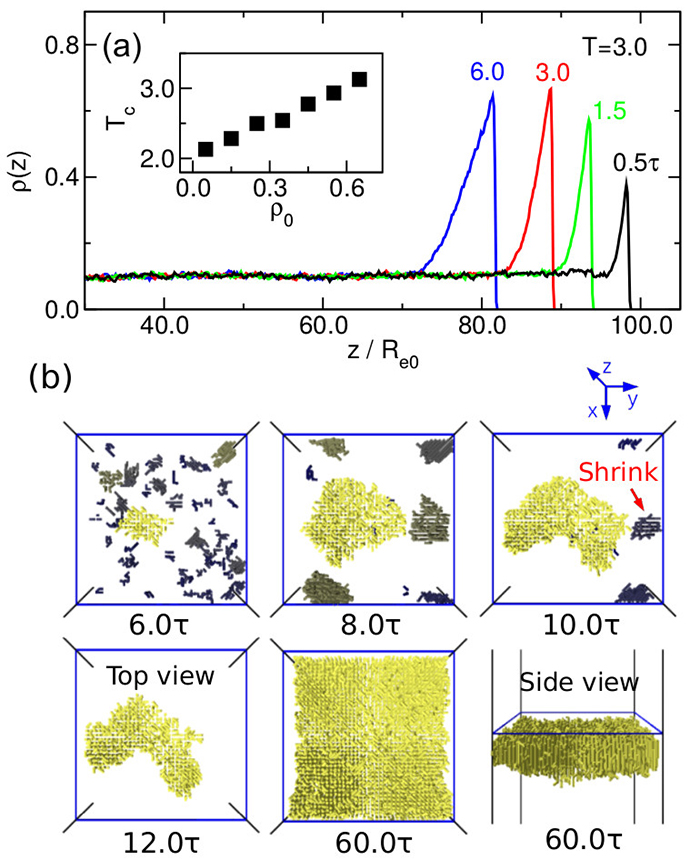 圖1顯示在快速蒸發過程中隨著界面向左退縮的高分子濃度分布及其界面結晶形貌。可以看到高分子在自由表面處形成高濃度表皮層。對于結晶高分子而言,其在溶液中的結晶能力與高濃度直接正相關:圖1(a)中的插圖顯示隨著單體體積濃度從0.05增加到0.65,結晶約化溫度從2.0增加到3.1。因此在特定溫度(例如3.0)下,本體濃度為0.1的溶液無法結晶,但是當快速蒸發形成的表皮層濃度高達0.65時,仍然可以結晶,且只會限制在二維表皮層。圖1(b)顯示高分子晶核在快速蒸發過程中,其中小部分特定取向的晶核獲得持續的生長,而其它晶核則逐漸消失,顯示出典型的Ostwald熟化過程。最終結晶時刻t=60.0τ晶核生長成二維高分子單晶。