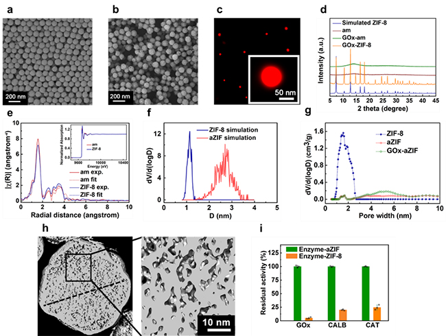 圖1. 無定形金屬有機(jī)骨架納米顆粒(a)以及酶-無定形金屬有機(jī)骨架復(fù)合物(b)的掃描電鏡圖;(c)酶-無定形金屬有機(jī)骨架復(fù)合物的超分辨熒光顯微鏡;(d)X-射線衍射;(e)X-射線吸收精細(xì)結(jié)構(gòu);(f)分子動(dòng)力學(xué)模擬孔徑;(g)氮?dú)馕綄?shí)驗(yàn)并通過NLDFT模型計(jì)算的孔徑分布;(h)冷凍電子斷層成像術(shù)直觀觀察到的酶-無定形金屬有機(jī)骨架復(fù)合物介孔;(i)包埋酶的表觀酶活性。