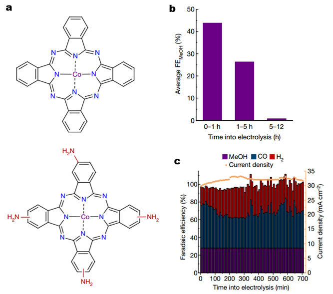 (a)CoPc和CoPc-NH2的分子結(jié)構;(b)CoPc/CNT在-0.94V下反應12個小時的甲醇選擇性變化;(c)CoPc-NH2/CNT在-1.00V下反應12個小時的產(chǎn)物選擇性變化