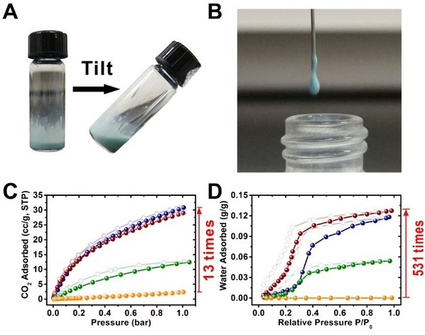 圖2. (A)(B)多孔液體的照片;(C)(D)分別為多孔液體儲存三個月后在273K下二氧化碳的吸附等溫線和298K下水蒸氣的吸附等溫線。相比于純PDMS溶劑,多孔液體二氧化碳和水蒸氣的吸附量分別提高了13倍和531倍。