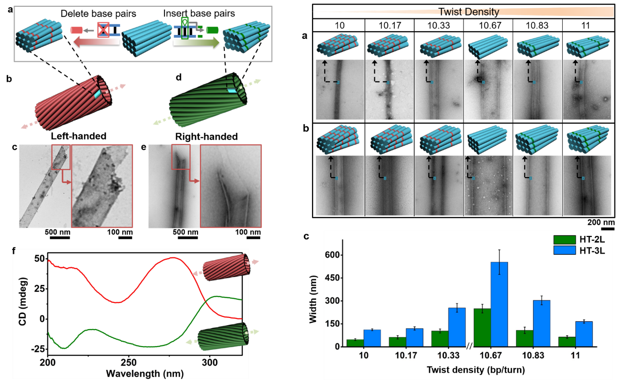 圖2 (左)手性可控的DNA納米管自組裝。(右)通過厚度和扭曲密度的控制可實現不同尺寸的DNA納米管構建。