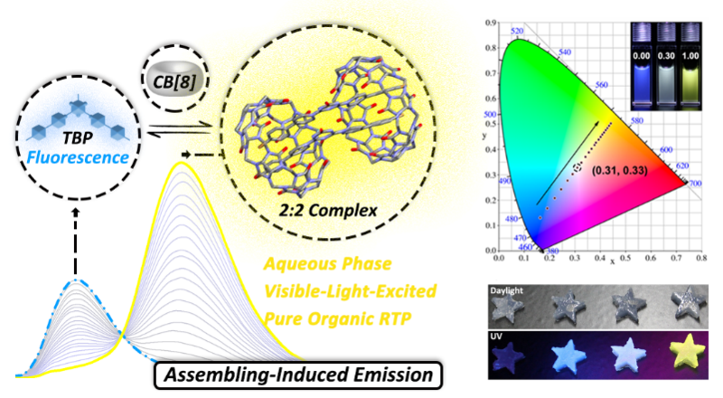 針對這一問題,田禾院士、馬驤教授科研團隊利用常見的超分子大環主體分子葫蘆[8]脲和簡單的染料客體分子,首次實現基于主客體組裝的可見光激發水相純有機室溫磷光。這一特殊的主客體絡合物也被用于實現Hela細胞成像以及多色發光水凝膠的制備,具有潛在的生物應用價值。這一通過組裝誘導發光(Assembling-Induced Emission)實現水相純有機室溫磷光的策略,打破了前期工作中溶液態磷光猝滅的限制,有望在時間分辨成像領域結合磷光的長壽命特性實現新的突破,為水相室溫磷光的構建提供了新的思路。