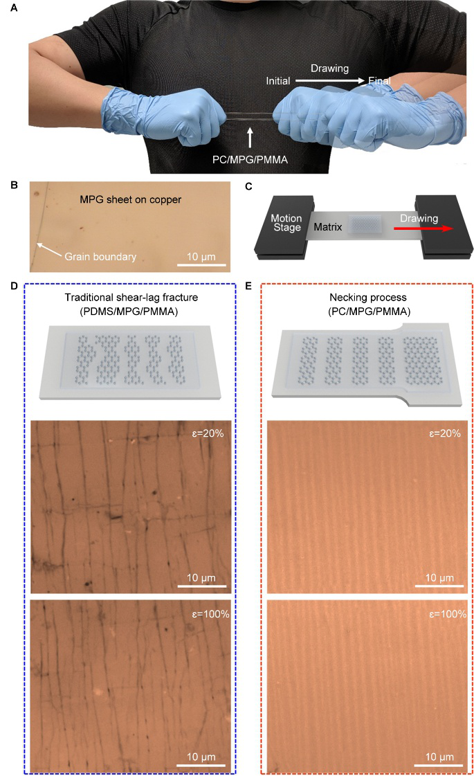 基于以上想法,團隊聯想到了在熱塑性聚合物加工領域的頸縮工藝。該頸縮工藝是指在外加拉應力作用下,熱塑性聚合物發生局部的頸縮現象,這種局部頸縮會在持續的拉應力作用下移動,且伴有強烈的局域應變,使得頸縮經過的部分寬度和厚度減小,長度延長,最終擴展到整層聚合物。受此過程中動態傳播的局域應變的啟發,團隊設計了一種三明治結構的單層多晶石墨烯及聚合物的復合體-聚碳酸酯/多晶石墨烯/聚甲基丙烯酸甲酯-并對其進行了簡便的頸縮工藝處理,最終觀察到了一個非常有趣的現象:在頸縮未經過的部分,石墨烯保持原貌;在頸縮經過之后,石墨烯斷裂成有序且寬度一致的納米尺寸條帶。在整個過程中,石墨烯的斷裂伴隨著頸縮的傳播而有序的發生。