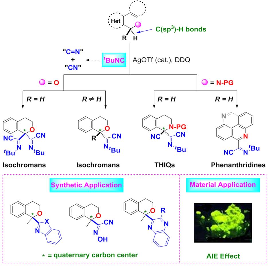 本次課題組在異腈研究方面又取得了新的突破。利用銀試劑作催化劑及DDQ作為氧化劑,實現(xiàn)了異腈對惰性的雜原子鄰位的C(sp3)-H鍵的連續(xù)插入,合成了一系列此前難于得到的氰基亞胺類化合物。通過ESI-MS/MS質(zhì)譜技術(shù)證實了產(chǎn)物氰基亞胺結(jié)構(gòu)中的氰基(CN)及亞胺結(jié)構(gòu)(C=N-R)均來自異腈。該方法避免了使用劇毒的無機氰化物,可高效構(gòu)建具有叔碳中心的復雜分子。研究結(jié)果表明,相關(guān)氰基亞胺類分子可以高效轉(zhuǎn)化為多個具有生物活性的分子。同時,利用該方法對材料分子進行結(jié)構(gòu)修飾時發(fā)現(xiàn),氰基亞胺是一類具有重要潛力的聚集誘導發(fā)光源(AIEgen),該性質(zhì)使得該類結(jié)構(gòu)在生物檢測和成像、細胞器染色、病原體識別等領(lǐng)域具有重要潛力。該工作為異腈在C(sp3)-H鍵官能團化方面的一個重要突破,尤其適合對復雜生物活性分子及材料分子進行后期官能團化修飾(Late-stage functionalization)。