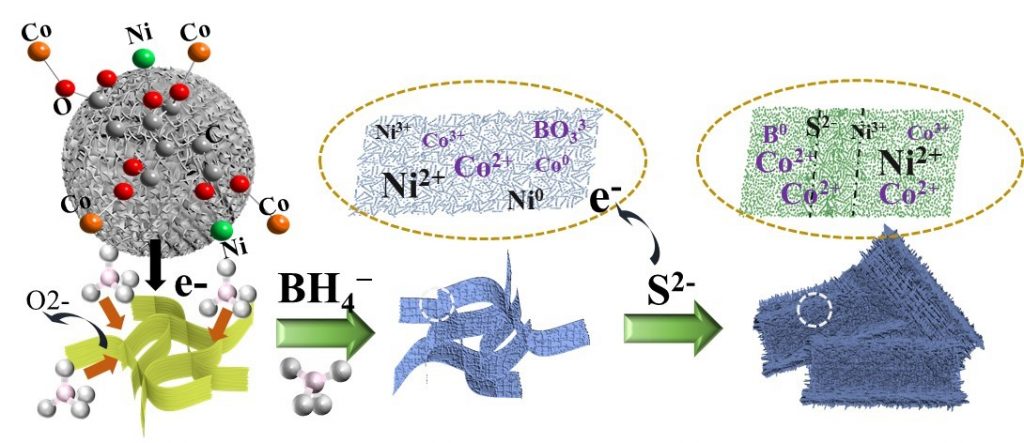 華中科技大學夏寶玉課題組通過氧化還原策略來調控雙金屬Co-Ni MOF納米薄片的結晶性和電子結構來增強材料法拉第電容。依次通過硼化和硫化處理后,得到穩(wěn)定低價的混合價態(tài)的Co-Ni MOF衍生物(Co-Ni-B-S)。該衍生物不僅保存了原始Co-Ni MOF的結構完整性,活化后表現(xiàn)為部分晶態(tài)和非晶態(tài)共存的結構,有利于實現(xiàn)優(yōu)異的電化學性能。測試結果表明:(1)活化后的Co-Ni-B-S樣品在1 A g-1的電流密度下,可達到1281 F g-1的高比電容;(2)在20 A g-1的電流密度下,可達到802.9 F g-1的高比電容,具有出色的倍率性能;(3)經(jīng)過10,000次循環(huán)后容量保留率可達到92.1%,表現(xiàn)出優(yōu)良的循環(huán)性能穩(wěn)定性。基于Co-Ni-B-S電極制造的儲能裝置在功率密度為857.7 W kg-1時表現(xiàn)出50.0 Wh kg-1的高能量密度,在12 A g-1下經(jīng)過5000次循環(huán),容量保持率可達到87.7%。同時,在以活性炭為負極組裝的超級電容器器件的測試中,發(fā)現(xiàn)器件在水系電解液中可以得到1.7 V的高電壓,給此材料的應用提供了更多的可能性。