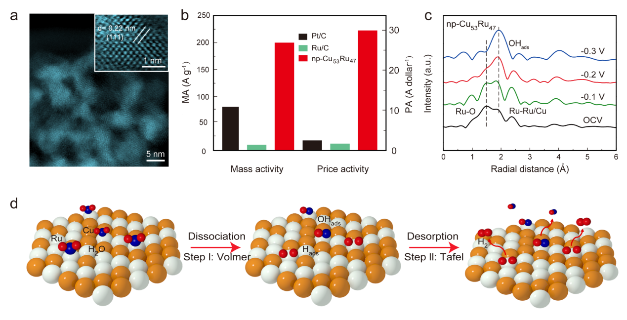 為此,譚勇文教授團隊通過傳統冶金技術結合脫合金工藝,制備出不同比例的三維納米多孔Cu-Ru合金。得益于多孔合金的高比表面積以及合金原子的協同作用,作為堿性電催化析氫催化劑,Ru-Cu合金(np-Cu53Ru47)表現出比商用Pt/C催化劑更高的活性和耐久性。團隊進一步采用原位同步輻射表征和理論模擬計算等手段對納米多孔銅釕合金在真實催化條件下進行系統的研究,發現釕原子摻入銅基體中,調制了合金的電子結構,不僅加快了水分子吸附和活化的反應步驟,還優化銅位點及釕位點對氫中間體的吸附-解吸能壘。這項工作不僅成功地合成了雙金屬合金并系統的研究其催化活性來源,而且為實現廉價而有效的能量轉換系統開辟了道路。