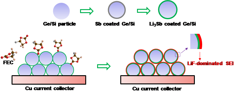 合金負(fù)極具有高比容量是目前電池的研究熱點(diǎn)。然而,充放電過程中伴隨的巨大體積變化仍是限制合金負(fù)極材料商業(yè)化的主要因素。研究表明,SEI膜可有效緩解商品化石墨電極表面與電解液的反應(yīng),對(duì)于電極的穩(wěn)定性起到舉足輕重的作用。而在合金負(fù)極表面,由于更加劇烈的體積變化,初始的SEI穩(wěn)定性達(dá)不到要求。因此,如何設(shè)計(jì)更穩(wěn)定、更致密、更薄的SEI對(duì)于提升合金電極材料性能的重要性不言而喻。