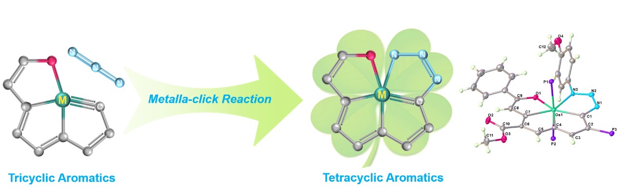 構建全新的芳環骨架,尤其是新稠芳環骨架,是發展具有獨特物理化學性能的π共軛新體系的重要基礎。但是,化學發展到今天,發現新的分子骨架日趨困難。在經典芳香化學中,由于碳是4價的,單個碳原子最多只能稠合3個芳香環(如石墨烯)。而過渡金屬可以有多個配位點,且具有種類多、價態與配體豐富等多樣性,此外,過渡金屬未充滿的d軌道可以替代主族元素的p軌道參與成鍵,為芳香化學的發展帶來全新的機遇。最近夏海平教授課題組實現點擊反應的新拓展--首例后過渡金屬卡拜與疊氮的[3+2]環加成反應,并籍此反應成功構建了首例以單原子為橋頭稠合四個芳環的極端大p共軛結構。從而,結束了“一個橋頭原子最多只能被三個芳香環共享”的歷史。