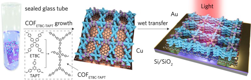 二維共價有機框架材料(2D-COFs)是一種具有可設計的π電子骨架和高度有序的拓撲結構的多孔二維層狀材料,其具有許多突出的性能,包括高的熱穩定性,永久的孔隙率,大的比表面積,低的質量密度等。2D-COFs的光電特性可通過選擇合適的單體組合來進行編輯。然而,2D-COFs通常是各向異性生長的,以固體粉末的形式存在,很難可靠地集成到器件中。