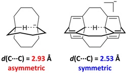 然而,在上述例子中具有對稱氫鍵的結構并不是體系的能量極小點。因此,接下來他們開始著手于利用理論計算設計一些更加合理的對稱C···H···C氫鍵。為了將兩個碳原子之間的距離固定在2.5 ?附近,作者參考了質子化1,6-二氮雜雙環[4.4.4]十四烷(1;其結構如圖1b所示)中的對稱N···H···N氫鍵。在該結構中,兩個氮原子之間的距離為2.53 ?。他們試圖通過設計分子內C···H···C氫鍵,并利用環張力強迫兩個碳原子靠近(圖3;左)。但是,這一策略并未取得成功。經過幾何優化,作者發現體系能量極小點中的C?H···C氫鍵是非對稱的,且兩個碳原子之間的距離長達2.93 ?。為了進一步縮短兩個碳原子之間的距離,作者通過引入籠狀結構(例如桶烯)進一步增加了體系的環張力。如圖3(右)所示,此時體系能量極小點中兩個碳原子之間的距離僅為2.53 ?,且C···H···C氫鍵是對稱的。至此,作者成功例證了對稱C···H···C氫鍵存在的可能性。